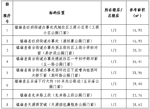 受鎮(zhèn)雄縣物業(yè)管理中心委托:公開(kāi)拍租鎮(zhèn)雄縣主城區(qū)內(nèi)8個(gè)公廁門(mén)面3年期經(jīng)營(yíng)權(quán)。相關(guān)事項(xiàng)如下: