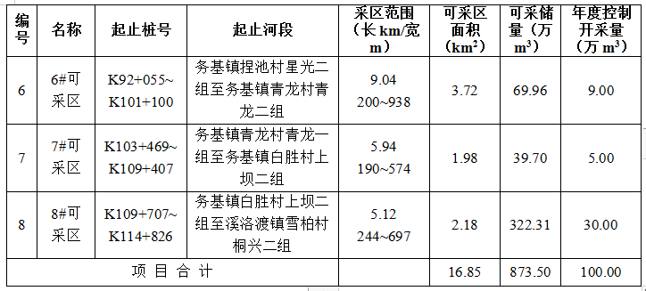 (二)規(guī)劃河段可采區(qū)劃定及基本情況表: